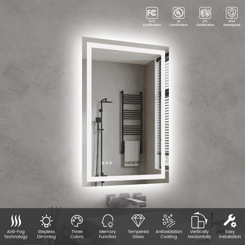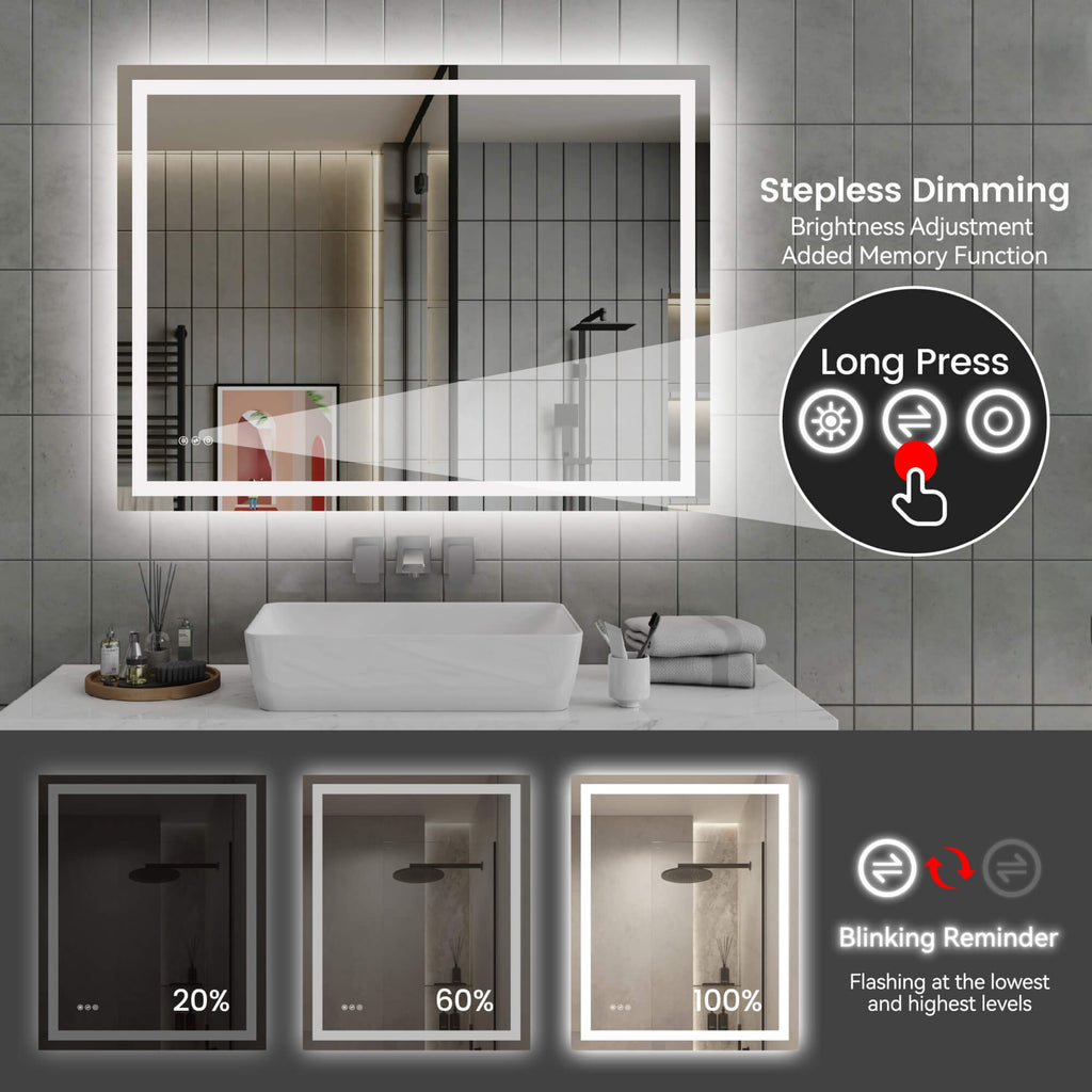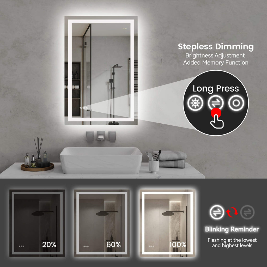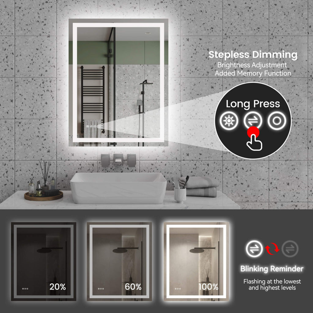 - 【Stepless Dimming & Memory Function】Touch the smart button to adjust brightness from soft ambient glow to full illumination. The built-in memory function automatically restores your last lighting setting when the mirror is turned on again.