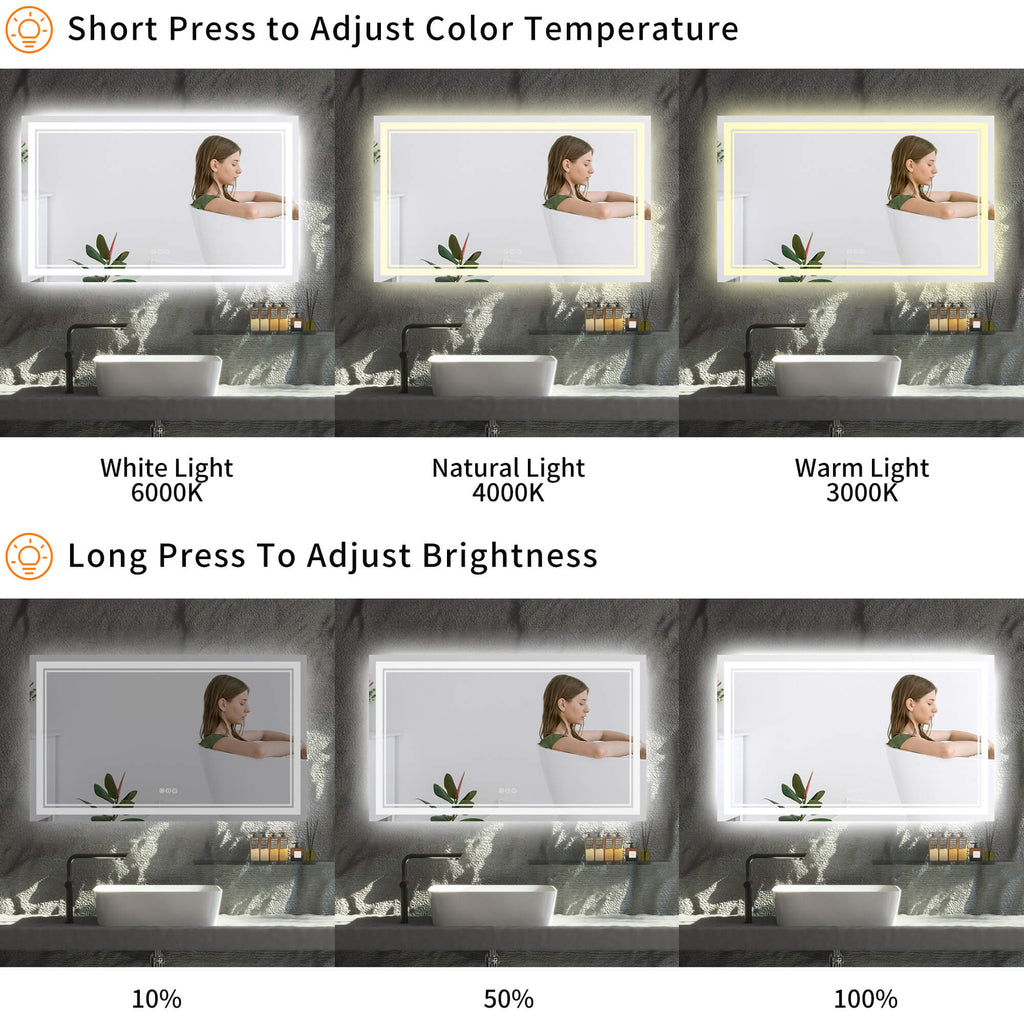 - 【Dimmable & Memory】The brightness of this modern mirror is dimmable, touch the light button for 1 second to turn the mirror light on/off. Touch the light button for 3 seconds to adjust the brightness of the mirror. When the LED mirror is restarted after a power failure, it will return to its last use without having to adjust again.