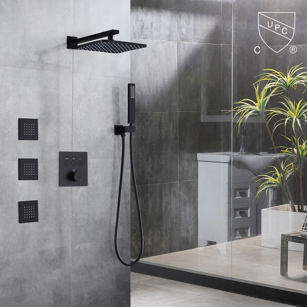 - BRUSHED GOLD FINISH COMPLETE KIT: Including 10-inch square rain shower head, handheld shower head, 15 inches shower arm, 59-inch shower hose, shower holder, shower mixer control valve, 3 Pcs Body jets.
