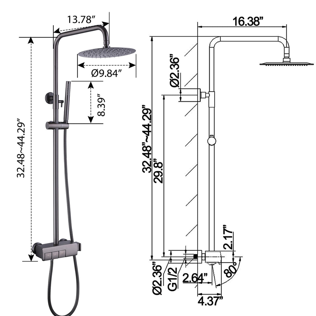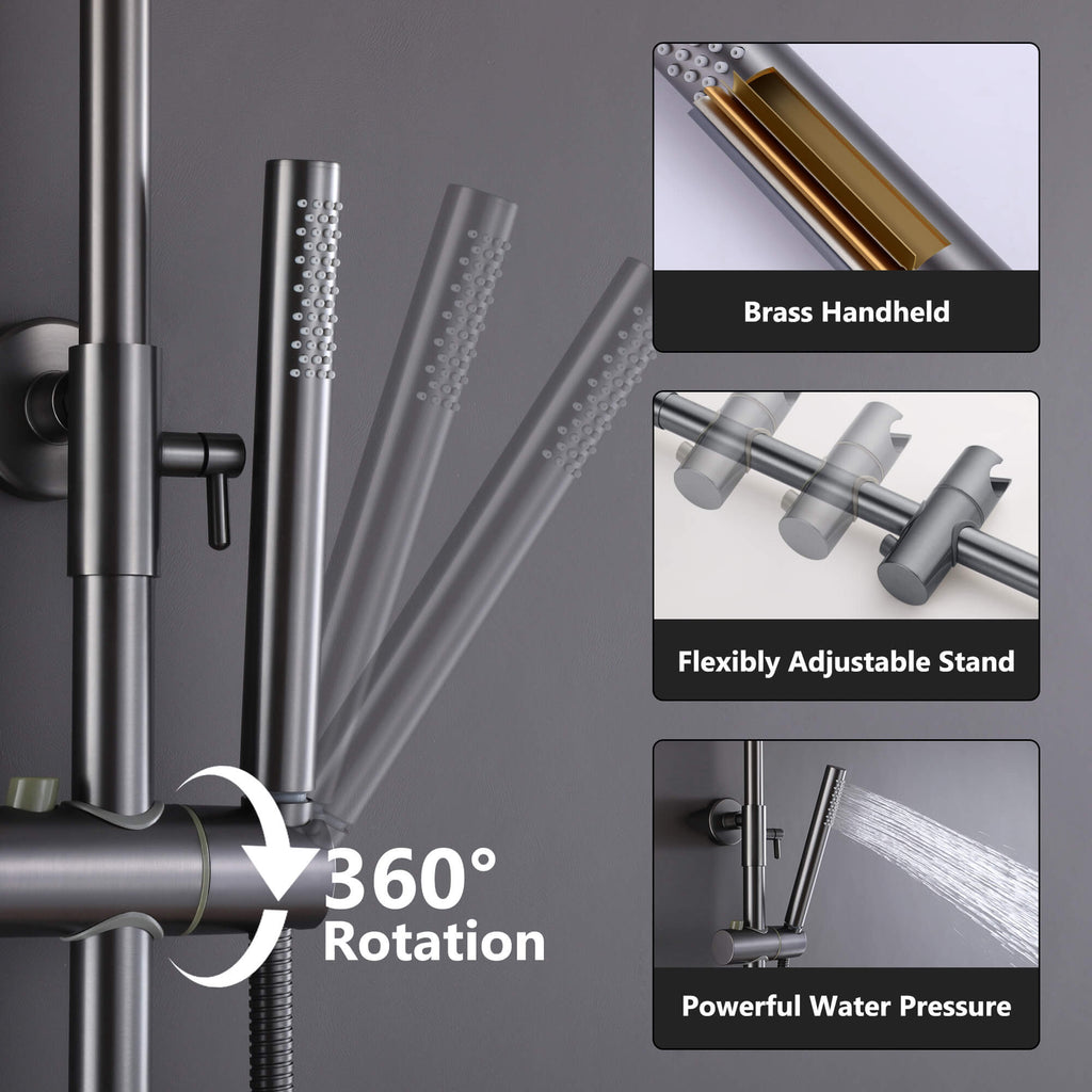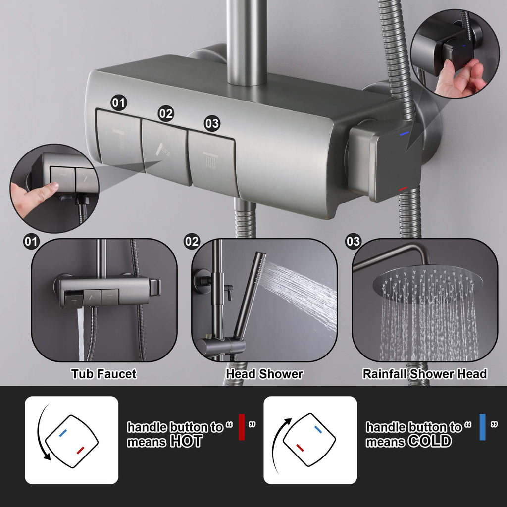 - 3 functions water outlet: rain shower, handheld shower, and bathtub faucet. This multi-function shower system adapts to different needs.